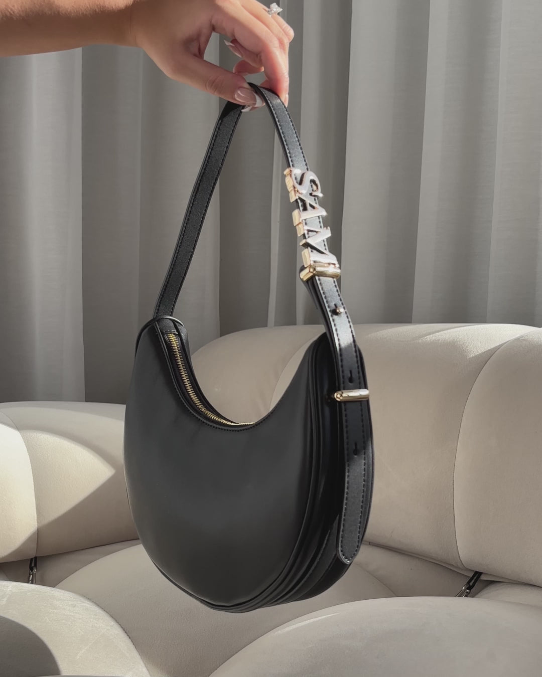 Crescent Shoulder Bag in Black/Gold with Personalised Hardware